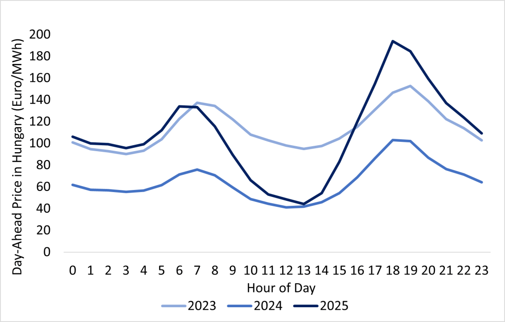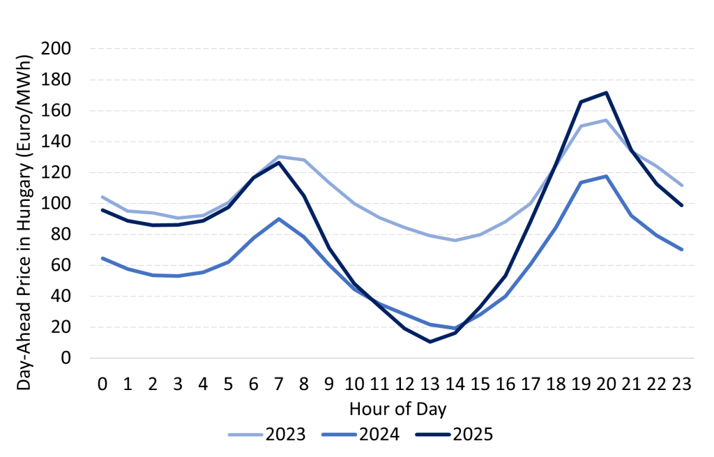 The growing share of solar in the electricity supply mix has introduced a new trend in hourly wholesale electricity prices. In the afternoons, especially during the low-demand spring months, prices often drop sharply — sometimes even turning negative. This phenomenon first appeared in U.S. markets like CAISO and later spread to European markets such as Germany, Spain, and the Netherlands. As renewable penetration continues to rise, more markets are experiencing similar patterns. Hungary is among those markets with the rapid growth of solar in its electricity mix.