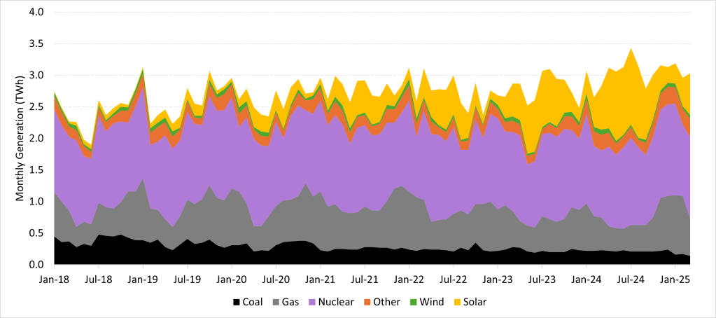 Focusing on the generation mix, Figures 3 and 4 illustrate how solar has recently become one of the primary sources of electricity. In some summer months, solar can account for around 35% of the electricity mix. At times, solar generation will be sufficient to meet the country’s power demand during low-demand hours, leading to duck-shaped price patterns, grid management challenges, and new opportunities for flexible resources.